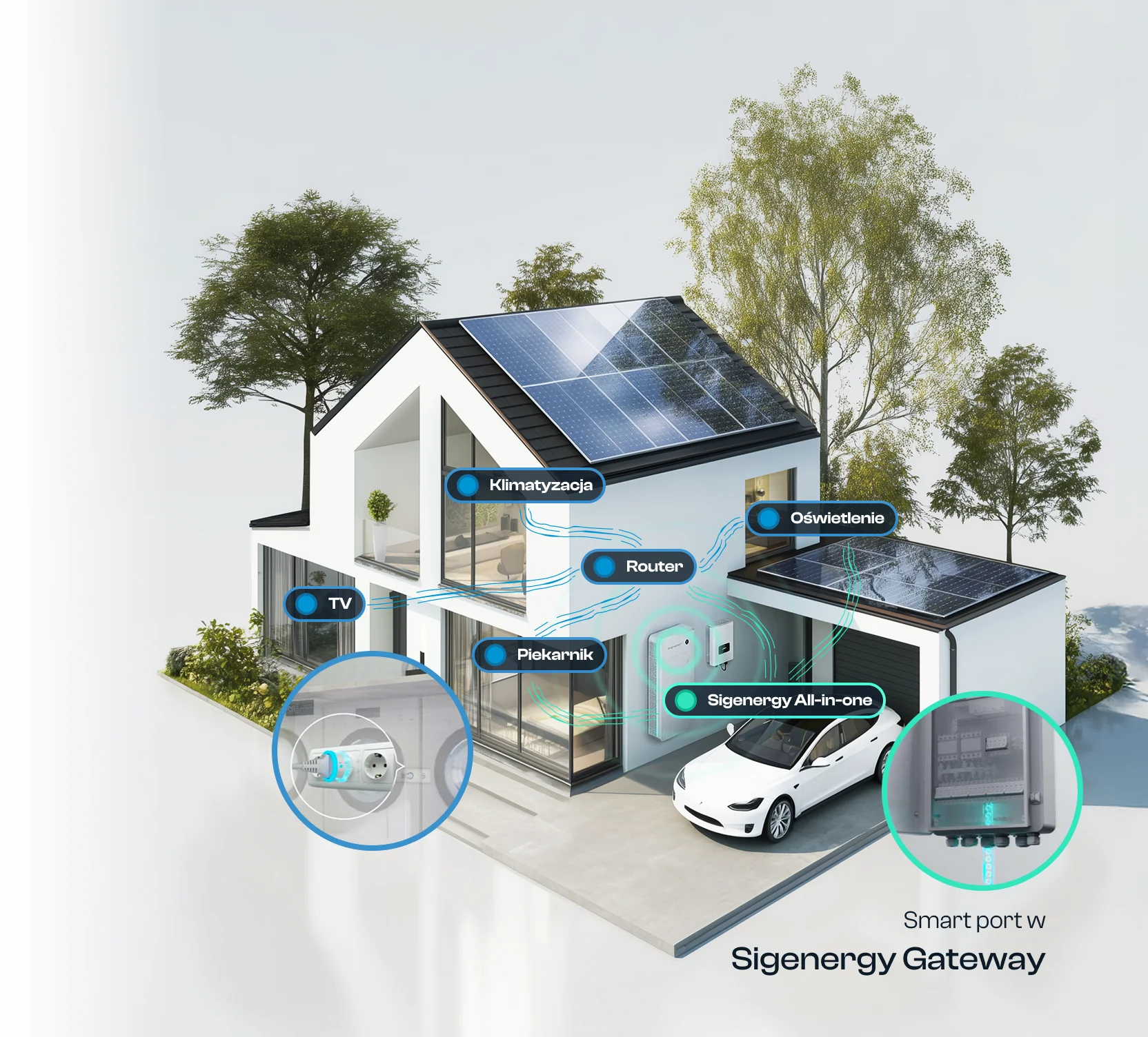 Dzięki Sigen Gateway ze smart portem oraz głębokiej integracji z systemem Shelly, wszystkie urządzenia – takie jak oświetlenie, ogrzewanie, klimatyzacja, gniazdka, piekarnik, router czy nawet pompa ciepła – działają w jednym spójnym ekosystemie generowania oszczędności na energii.